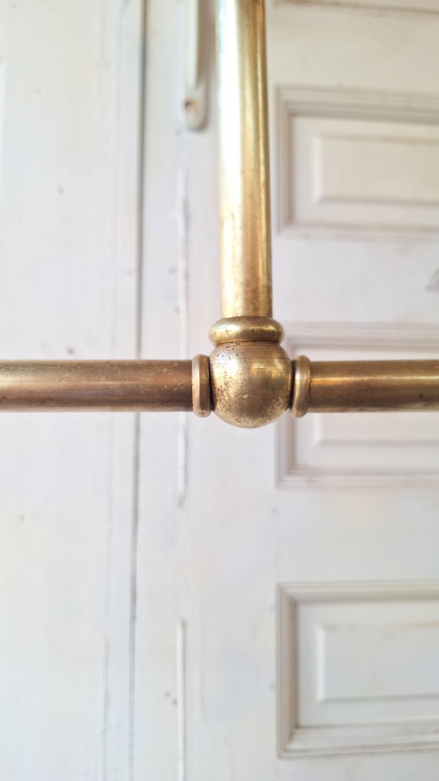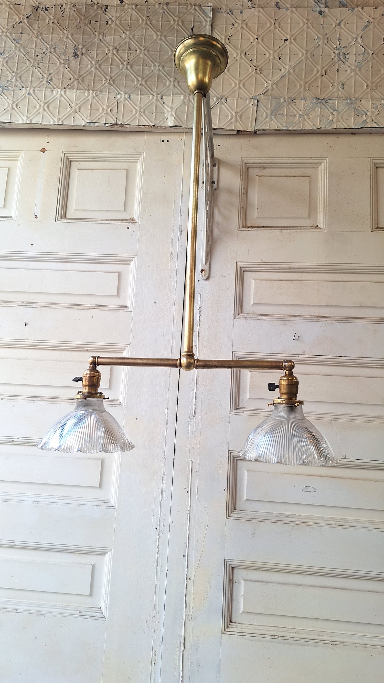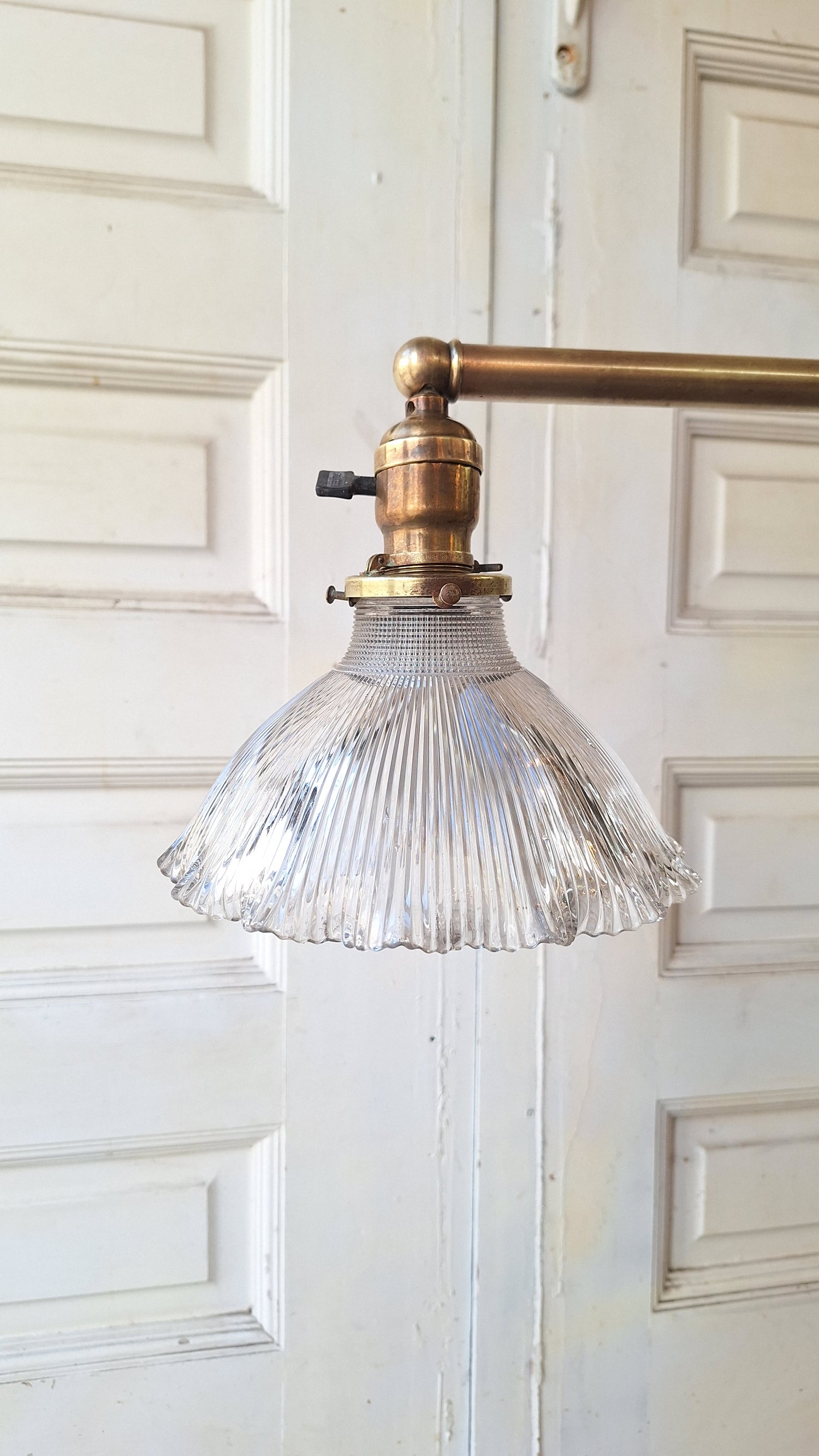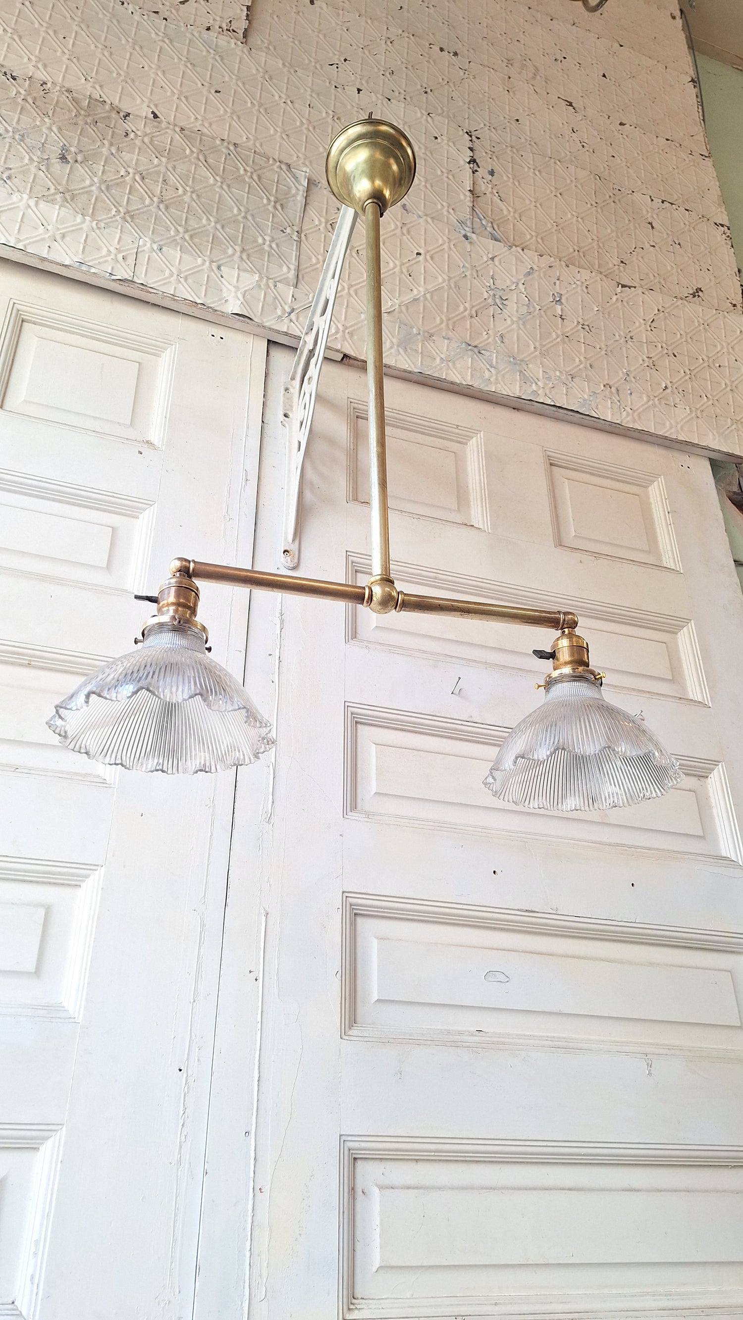 Sparkling holophane shades with ruffled edges suspended from an antique brass ceiling fixture. This vintage light has been rewired with all new wiring and is ready to install. This style of light is simple, but beautiful. They are perfect for hallways, offices, reading nooks, or placed above a kitchen sink or island as additional lighting.