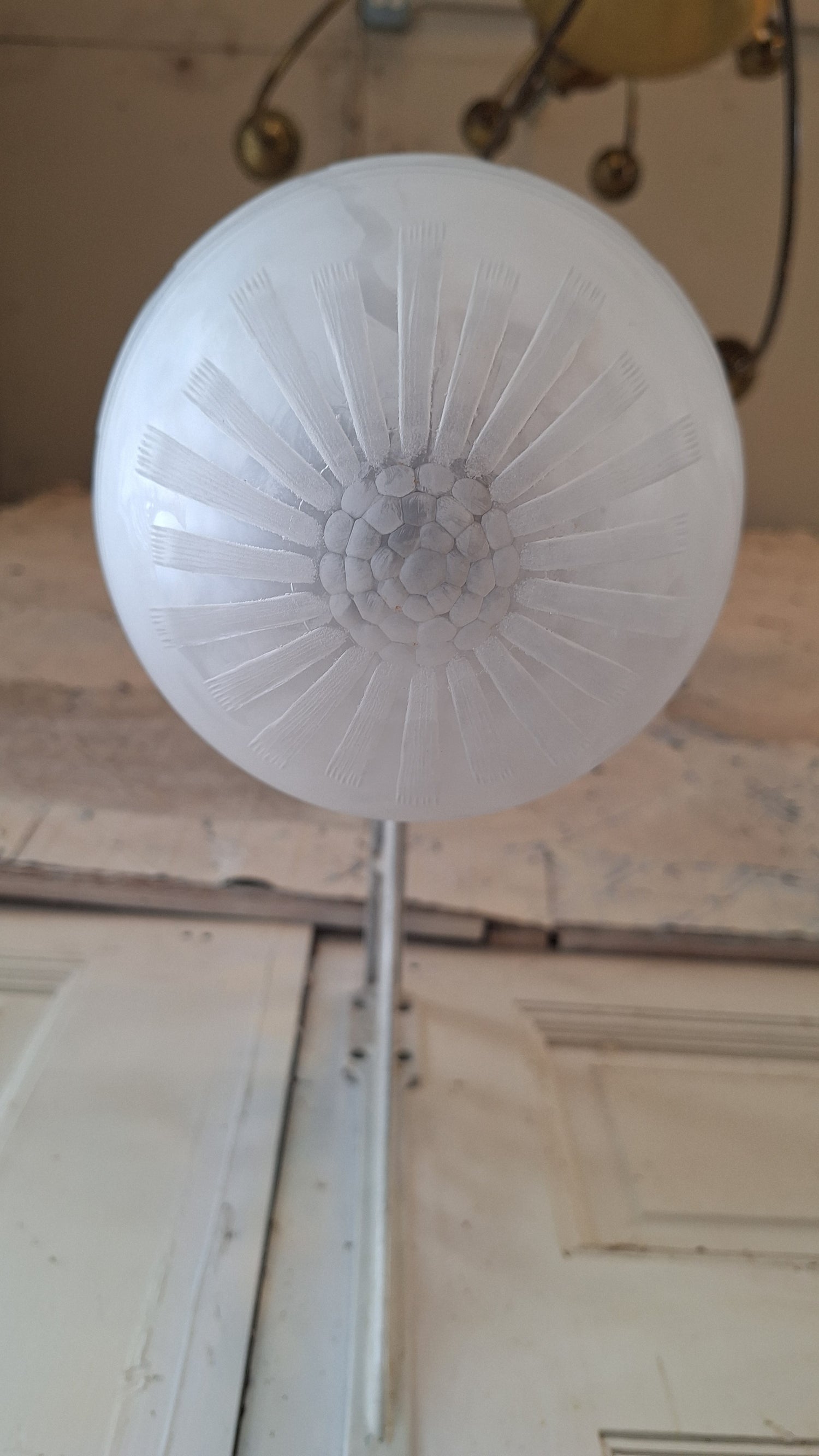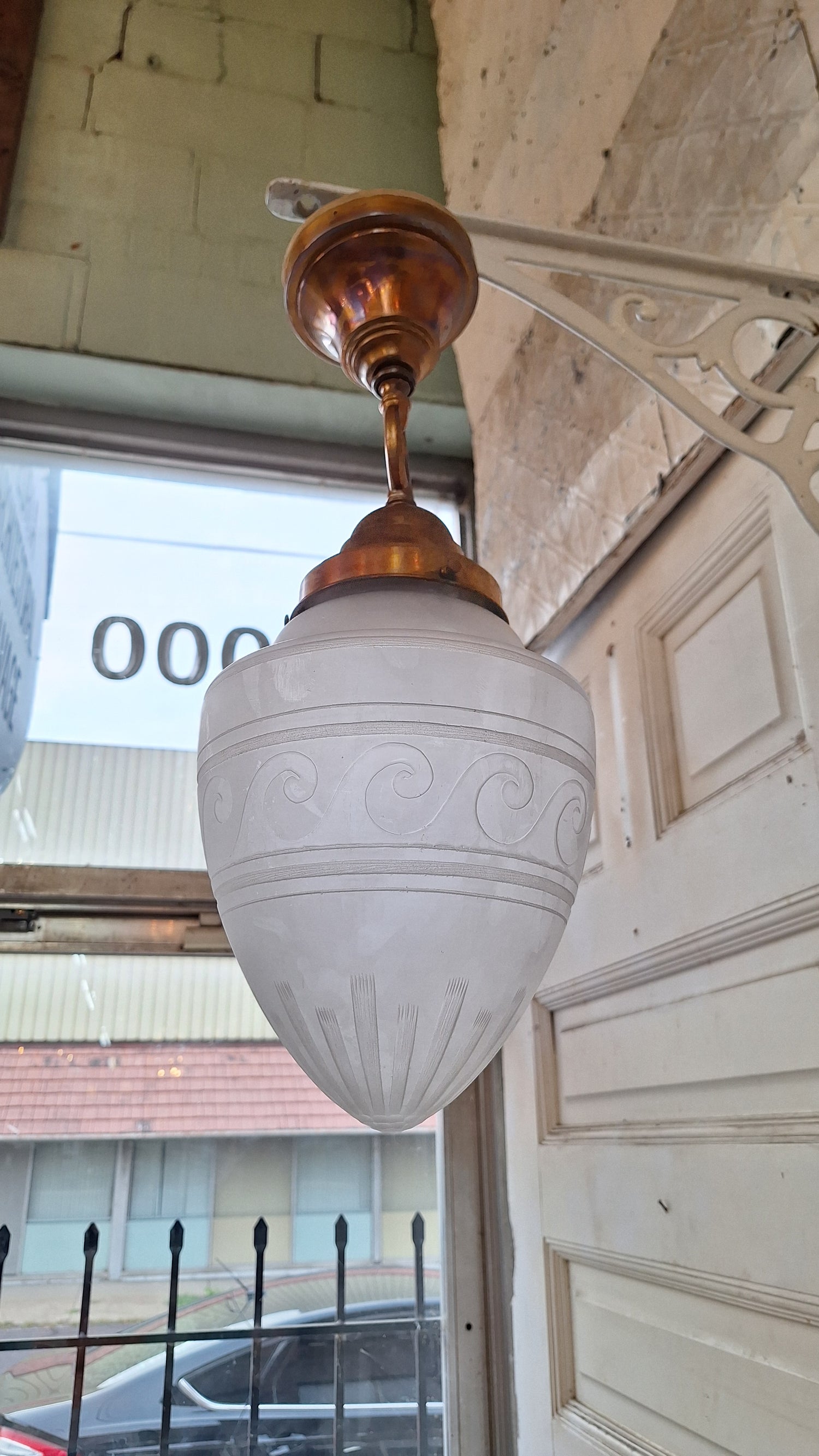 An elegant vintage light with an etched glass globe and a brass base. This would be a beautiful addition to a hallway, bedroom or bathroom. The glass features a beautiful wave pattern with banding around the globe. It has been rewired and is in working order. There are signs of age like slight discoloration marks or scuffs on the surface of the glass. Please see all of our pictures for details.
