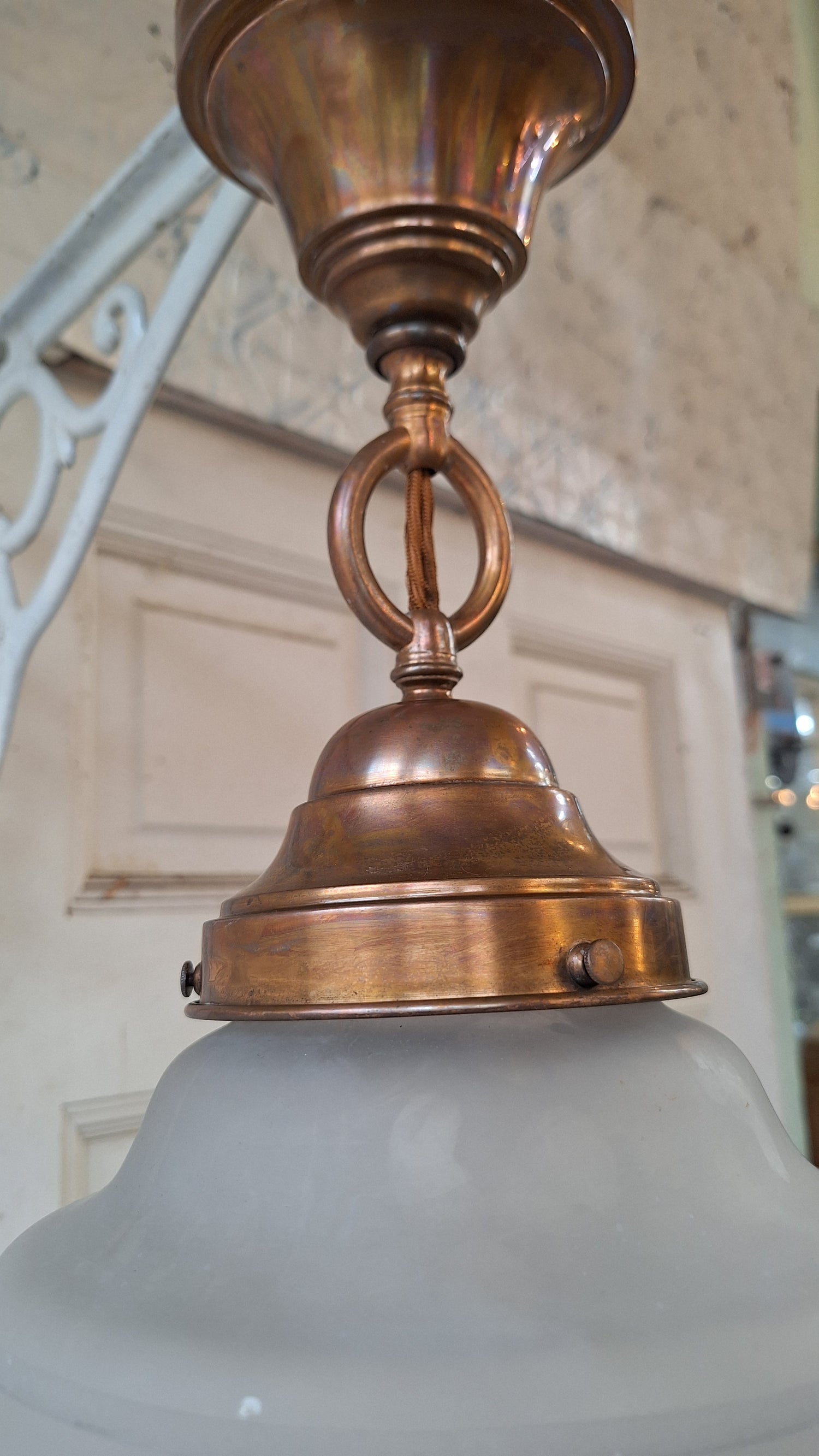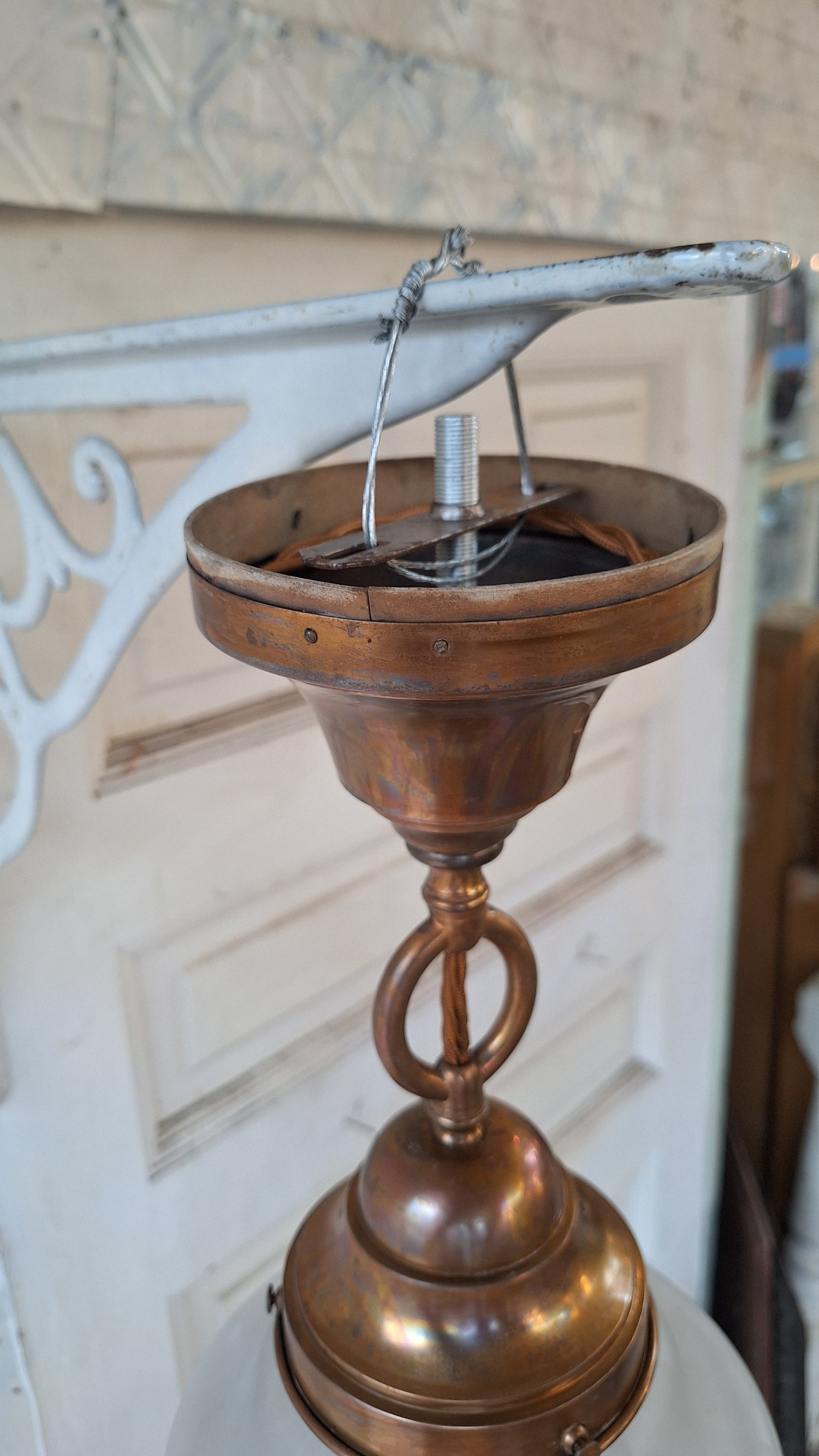 This vintage pendant light measures approx. 18" long by 4 1/4" across the canopy. The globe itself is approx. 9" tall. This light ships free within the continental US. No PO boxes please. There are two identical lights in this design available through this listing.