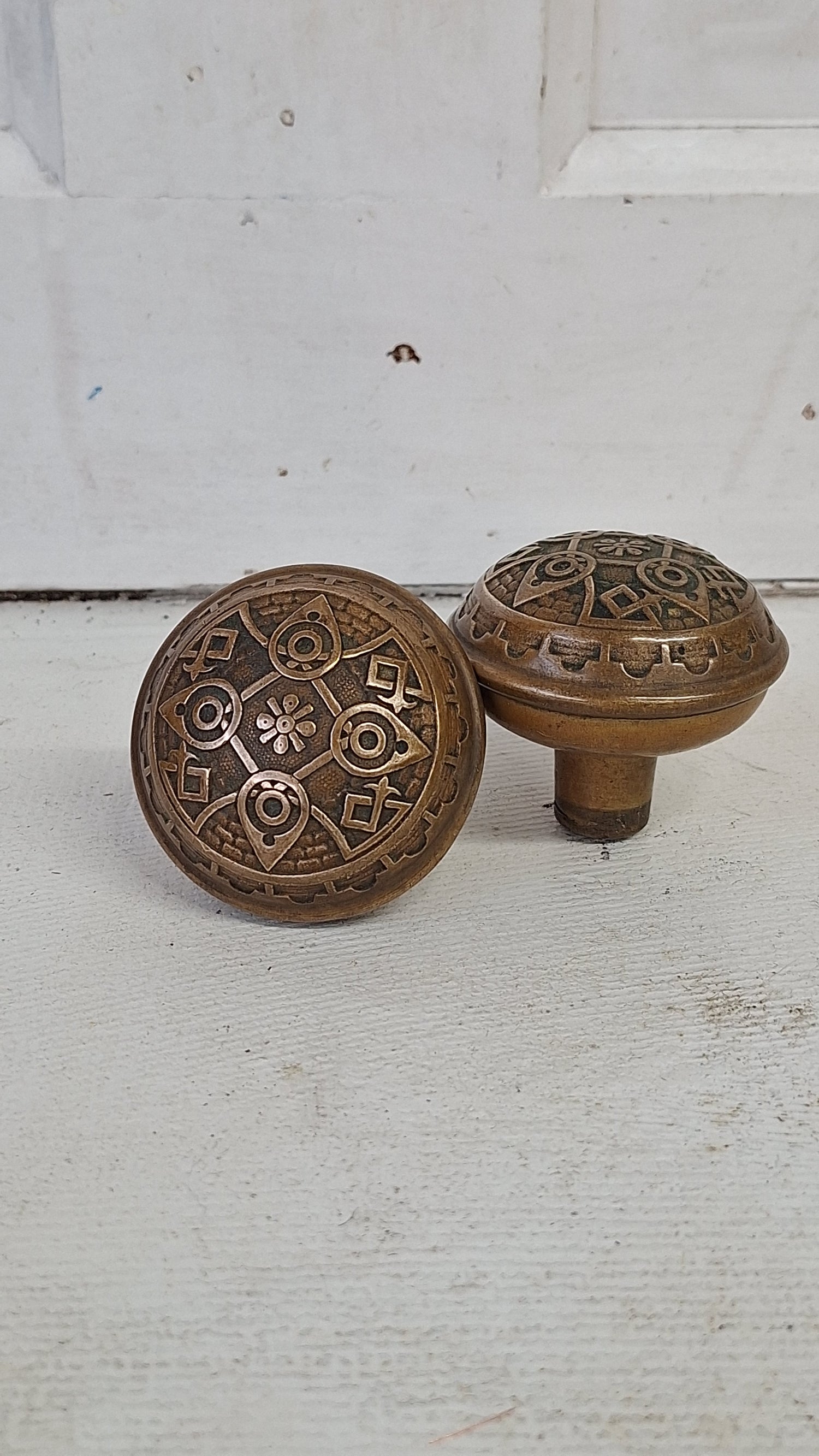 A set of two antique wrought brass or bronze doorknobs by Norwalk. This pair comes with two knobs, a spindle, and set screws. We have very lightly polished the face of the knobs to bring out the design although buyers can polish to a brighter finish if desired. One set has a crack in the base of the shank; this pair is available for a lower price, see drop down menu for options. This pair ships free within the US.